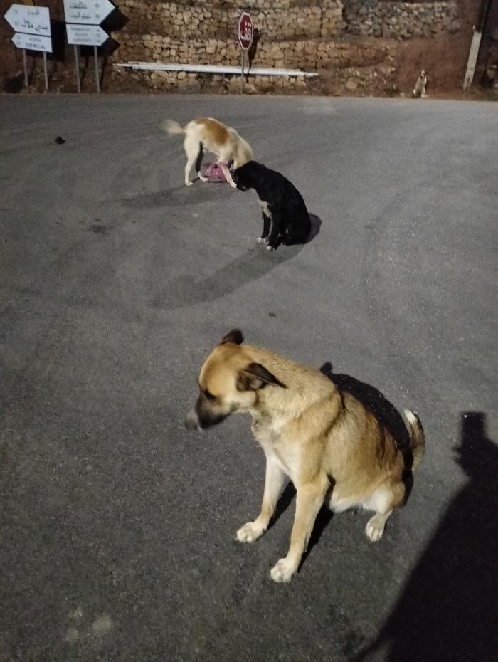 Four dogs are on a paved road. In the foreground, a tan and brown dog stands facing left, looking down. Further back, a cream-colored dog is near a dark object, possibly eating, while a black dog sits beside it. In the distance, another dog is visible near a stone wall. Road signs are above the wall, and a stop sign is to the right. The lighting is dim, casting long shadows.