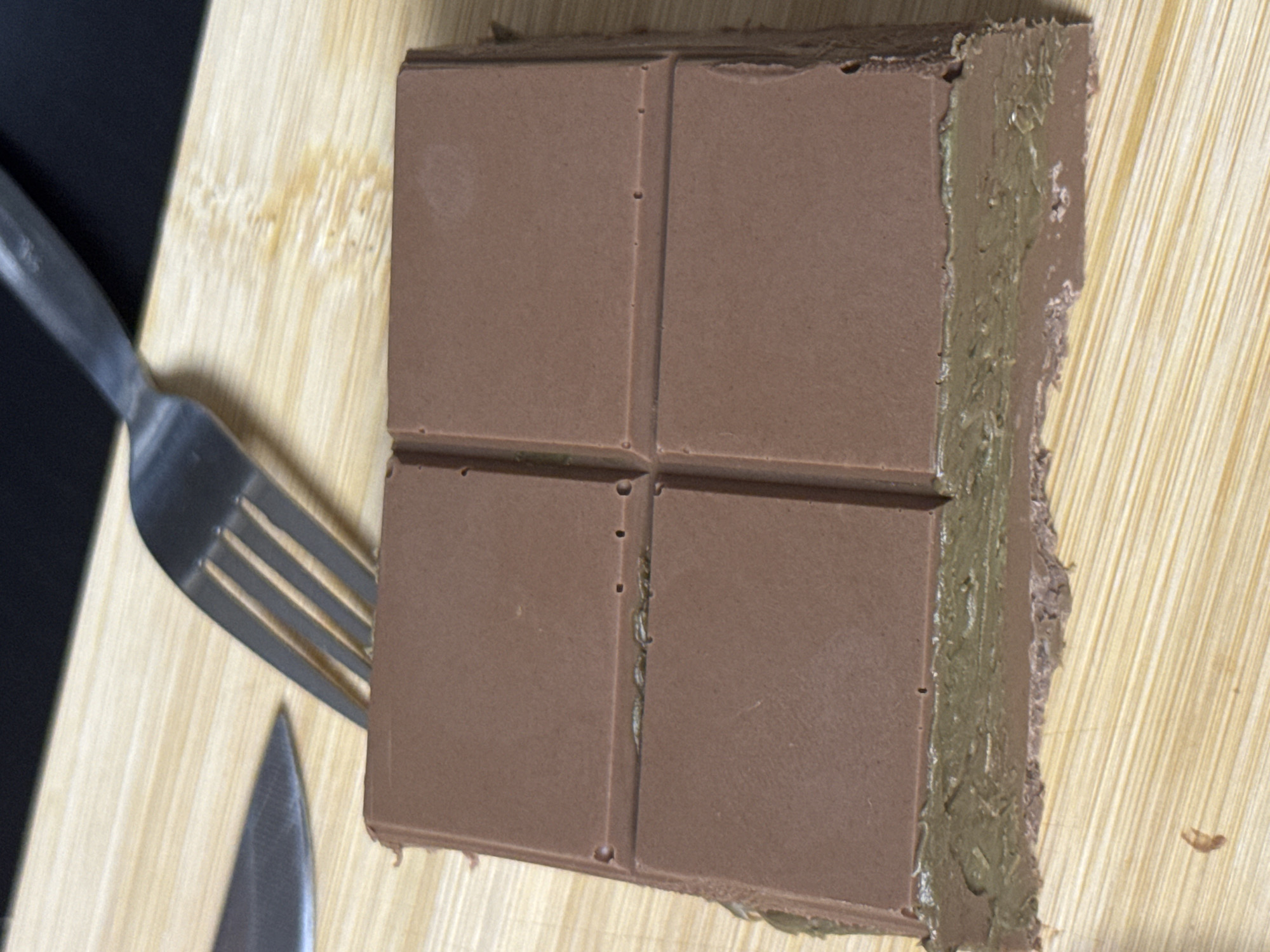 - "A close-up, eye-level shot shows a roughly square-shaped, multi-layered chocolate dessert resembling a large chocolate bar cut into four segments on a light-colored wooden cutting board" by FM-j6stS2, licensed under CC BY 4.0