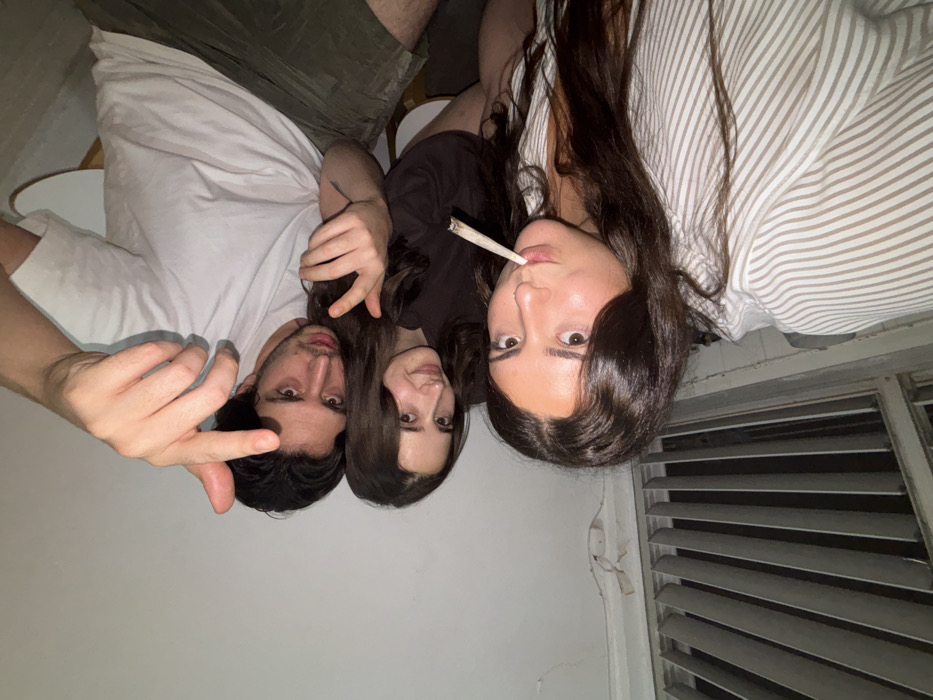 An image captured from a low angle is rotated 90 degrees clockwise, depicting three individuals posing closely together in what appears to be an indoor setting within the city of Unknown, Unknown. In the foreground, on the right side of the rotated image, a female with long dark hair and a light-colored striped shirt looks directly at the camera with wide eyes. A hand-rolled cigarette (joint) is held between her lips. Behind her, in the middle of the frame, another female with long dark hair and a dark top looks towards the camera with a slight smile. Her left hand is visible near her face, making a gesture with curled fingers. Further in the background, towards the left of the rotated image, a male with dark hair, a white t-shirt, and dark shorts is positioned above the other two. He is also looking directly at the camera, with his right arm extended upwards, and his hand forming a gesture where the thumb, index, and pinky fingers are extended. The immediate background consists of a plain, light-colored wall. In the lower left quadrant of the rotated image, a portion of a window or vent with horizontal slats is visible. Above this structure, the wall shows evidence of peeling paint or plaster. The overall lighting suggests an indoor environment, possibly under artificial light.