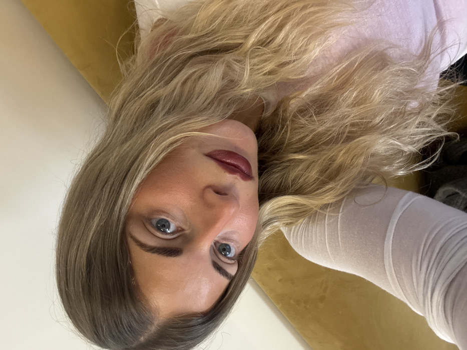 The image displays a head-and-shoulder portrait of a young adult female, positioned with her head tilted to the viewer's left. She has long, wavy, blonde hair with darker roots, blue eyes, and visible dark eyebrows. Her skin appears tanned, and she wears dark red lipstick. She is dressed in a light-colored, possibly white or light pink, long-sleeved top with a sheer, textured fabric. The background consists of a partially visible, plain yellow or gold upholstered surface, suggesting an indoor setting. No specific identifying features of a city, including Paris, France, are discernible within the frame to establish a precise location. The individual maintains direct eye contact with the camera.
