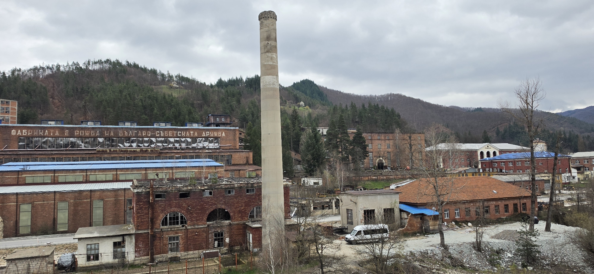 The image depicts a complex of old industrial buildings in Rudozem, Bulgaria, against a backdrop of forested hills under an overcast sky