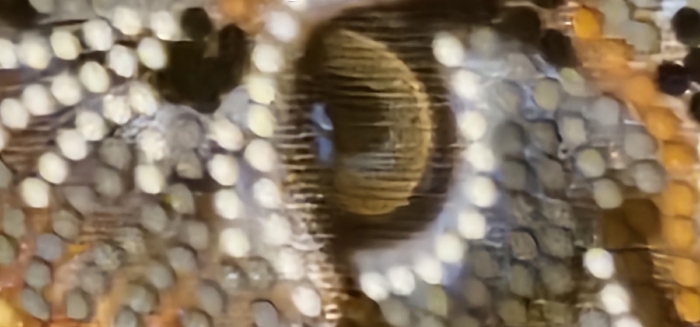 The image displays a detailed, close-up view of a stylized eye, observed within an environment in Kamenz - Kamjenc, Germany. The eye's iris is characterized by a dominant amber-brown coloration with prominent vertical, fibrous striations. Centrally positioned within the iris is a dark pupil, which contains a small, bright, quadrilateral reflection on its superior aspect. The area surrounding the eye, and extending across the entire visible frame, is composed of numerous individual, roughly oval to circular elements. These elements exhibit a varied color palette, including shades of light beige, off-white, various grays, and orange-brown tones, creating a textured, mosaic-like, or pixilated quality across the surface. The scene is static, focusing exclusively on the intricate details of the eye and its immediate patterned surroundings; no human figures or dynamic actions are discernable.
