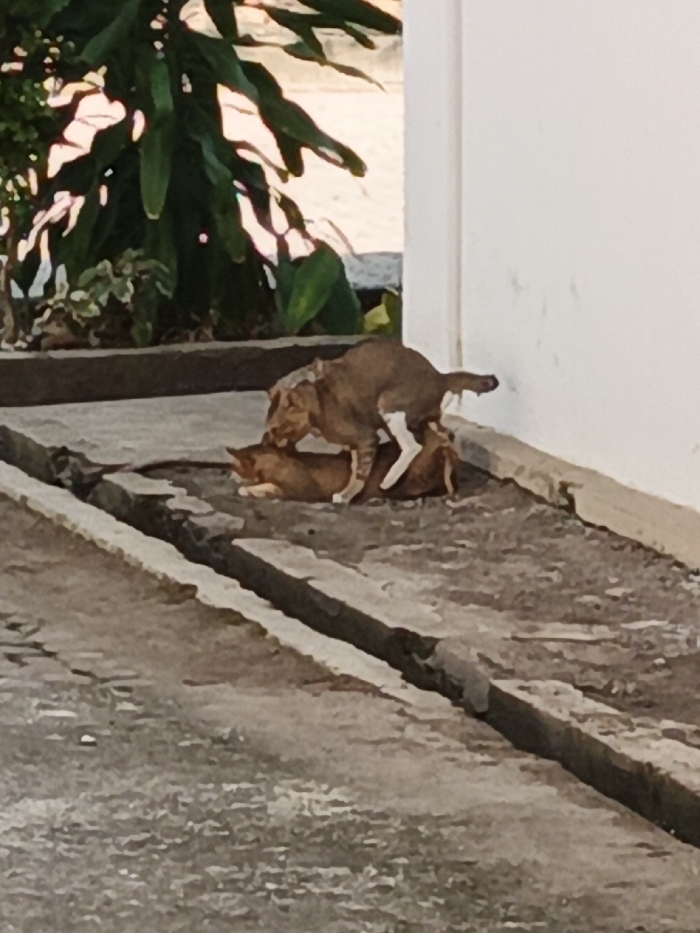 This image, taken in Lhokseumawe, Indonesia, depicts an outdoor scene featuring two domestic cats engaged in mating behavior on a concrete surface