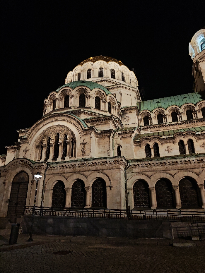 The image captures the St. Alexander Nevsky Cathedral in Sofia, Bulgaria, at night. The monumental Orthodox cathedral, constructed of light-colored stone, is artificially illuminated against a dark sky. A prominent gilded central dome, featuring multiple arched windows, rises above the structure. Below, several smaller domes and tiered roofs exhibit green patination, contrasting with the stone. The facade is intricately detailed with numerous arched windows, decorative cornices, and carved elements, including crosses. A large, dark, arched entrance is visible on the left side of the building. In the lower foreground, a cobblestone pavement leads towards the cathedral, separated by a dark metal railing. A black lamppost with a glowing white light source stands on the left, adjacent to a dark, cylindrical receptacle. No individuals are visible in the scene.