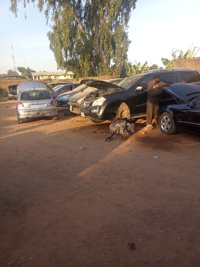 A mechanic works on the engine of a black car, the hood is up, and the wheel has been removed. The car is parked next to a dark SUV with its hood also raised. Several other dusty cars line the background, including a silver hatchback. Tools and a spare tire sit on the dusty ground next to the vehicles. A tall tree is behind the cars and a building is in the background.