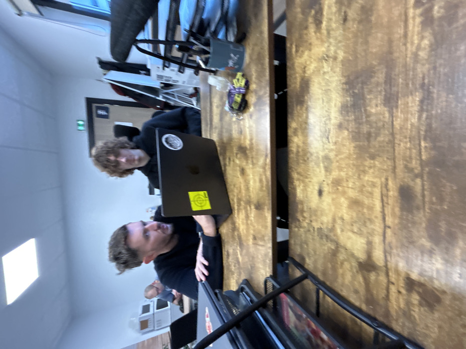 The image displays an indoor office environment in Illkirch-Graffenstaden, France; no specific address within the city is visually identifiable. Two Caucasian males are seated at a light-brown wooden desk with a visible grain. The male on the left, with short brown hair and a beard, wearing a black long-sleeved shirt, is leaning forward, intently focused on an open black Apple MacBook laptop positioned directly in front of him. His right arm rests on the desk, and his left hand is near the laptop's trackpad area. The laptop's lid features a yellow target-shaped sticker and a circular black-and-white sticker. The male seated to the right, behind the laptop, has shoulder-length curly brown hair and wears a dark hooded sweatshirt; he is also looking towards the laptop screen. On the desk to the right of the laptop, a dark-colored cylindrical pen holder, a black mesh document tray containing papers, a small keyring with a purple and yellow object, and a white adhesive tape dispenser are visible. A black metal mesh multi-tier document organizer is partially visible on the far left of the desk in the foreground. In the blurred background, a third Caucasian male with short hair and glasses is observed working at a separate desk with a laptop. The office features light-colored walls, a rectangular overhead fluorescent light fixture, and a brown door with a green exit sign mounted above it. A window with a dark frame is partially visible on the far right.