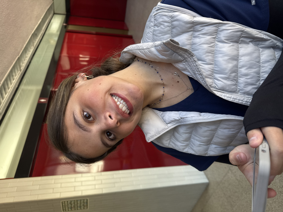 A female individual, appearing to be a young adult, is depicted from the chest up, smiling directly into the camera. She has brown hair and brown eyes. Her attire consists of a light grey quilted puffer vest, unzipped, worn over a navy blue V-neck top. A "SKECHERS" logo is visible on the lower right portion of the blue top. A black long-sleeved garment with a thumbhole is visible on her left forearm. She wears a gold-toned necklace with small blue beads and a secondary, thinner silver-toned necklace with a small circular pendant and a small cross pendant. Her left earlobe displays multiple piercings, including a gold-toned elongated link earring. In her left hand, she holds a white smartphone. The scene is located indoors in Interlomas, Mexico. The background features a cream-colored tiled column on the left and a large, flat red wall to the right. A partially visible gender-neutral restroom symbol is present above the red wall.