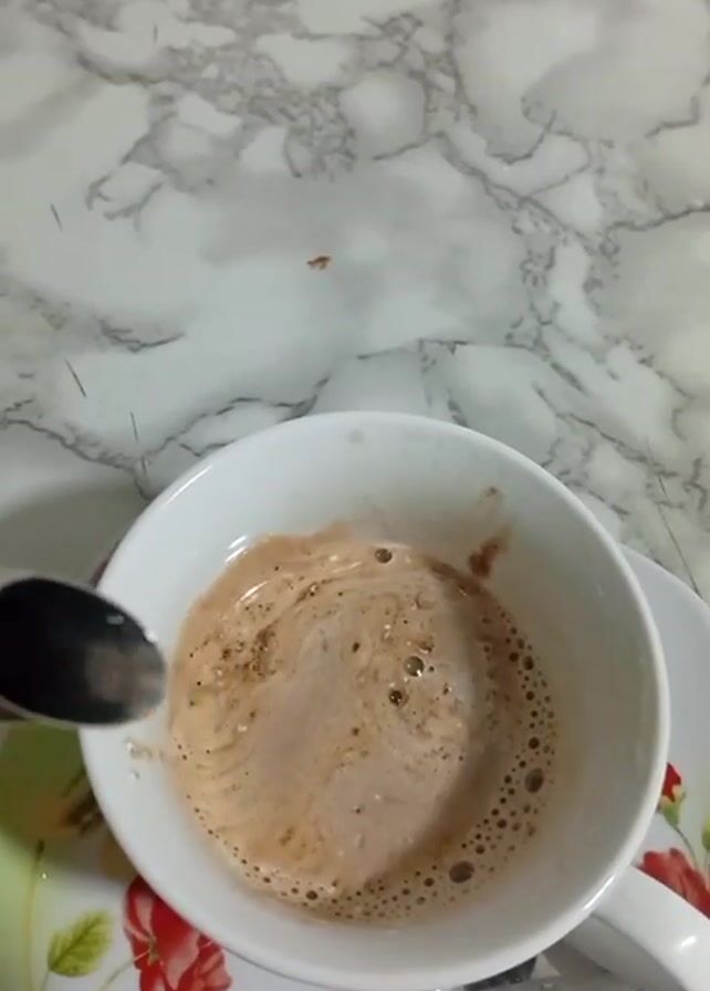 cup of coffee on a small plate. A spoon sits next to the cup on the plate. A stream of water is poured into the coffee cup. The table beneath is white with a marble pattern.