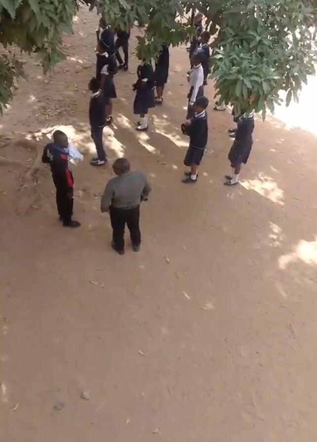 group of students and two adults standing outside under the shade of a tree. The students are wearing school uniforms of black, white, and blue. Two adults are standing near the students. The surface below them is dirt and has scattered rocks and fallen leaves. The camera is positioned at a higher angle, possibly from a window. The scene is well-lit and appears to be outdoors on a sunny day. The exact action or conversation is not clear from the visual information.