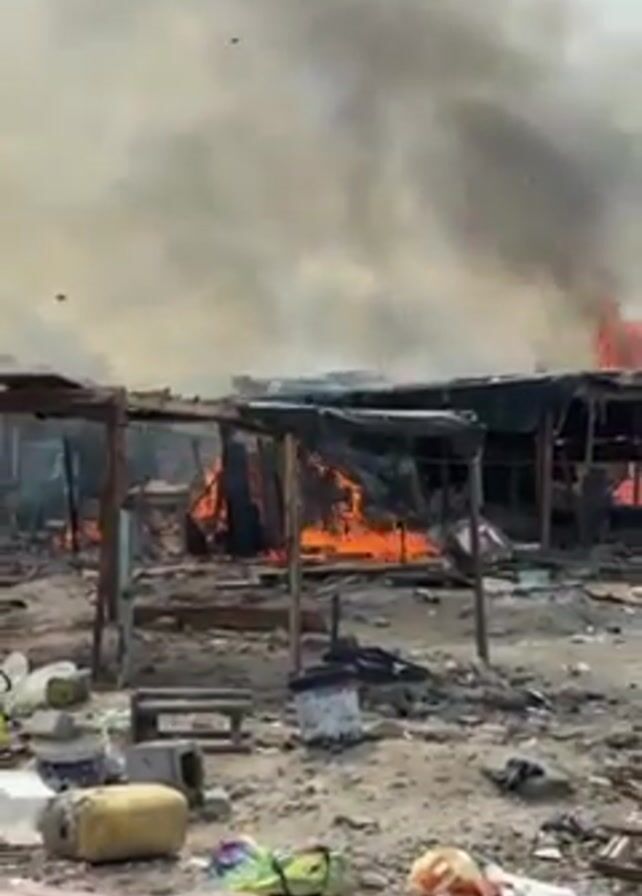 structure engulfed in flames, with a thick column of smoke rising into the sky. The structure appears to be a series of small buildings or stalls, possibly in a market or residential area. The buildings are constructed of wood and other materials, which are now burning intensely. The ground is littered with debris and what appears to be personal belongings. The scene suggests a devastating fire.