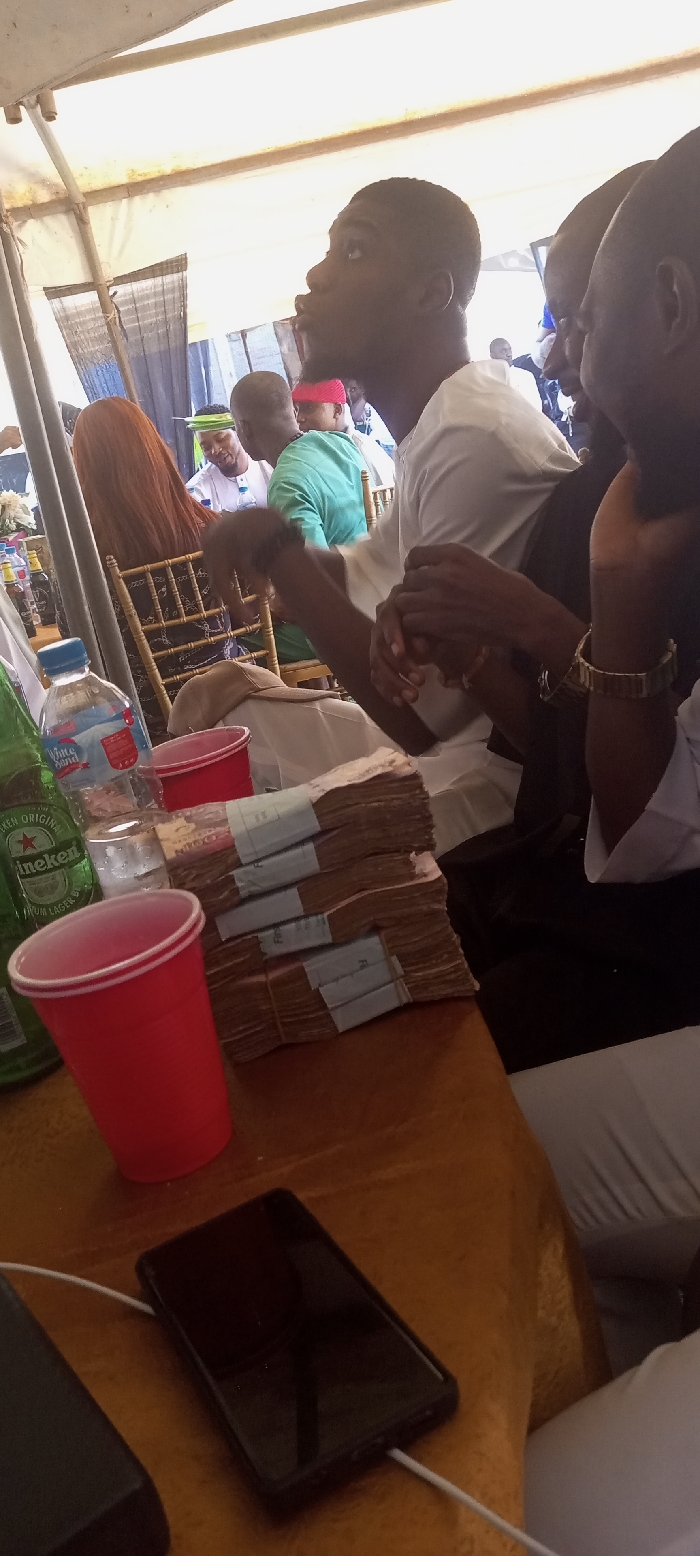 The image depicts a social gathering taking place under a white tent in the city of Nnewi, Nigeria. In the immediate foreground, a wooden table displays several objects: a green Heineken beer bottle, a clear plastic bottle of "White Sand" water, and two red plastic cups. Prominently featured are five neatly stacked bundles of Nigerian Naira banknotes, secured with paper and rubber bands, with some bands labeled "First Bank." A black smartphone, its screen off, is connected via a white charging cable to an unseen power source, lying next to a dark, rectangular power bank. In the midground, several individuals are seated. On the right, a person in a white shirt and dark clothing, wearing a gold-colored wristwatch, is partially visible, with their hands clasped. To their left, a young male in a white short-sleeved shirt, with a short haircut and light beard, is seen in profile, looking upwards and to his right. Behind these individuals, other attendees are visible. These include a woman with long, reddish-brown hair, seen from behind, seated on a woven-back chair. Further back, men in varying attire, including a teal/green shirt and a red head covering, are seated and engaging. The overall environment suggests an organized event with multiple attendees.