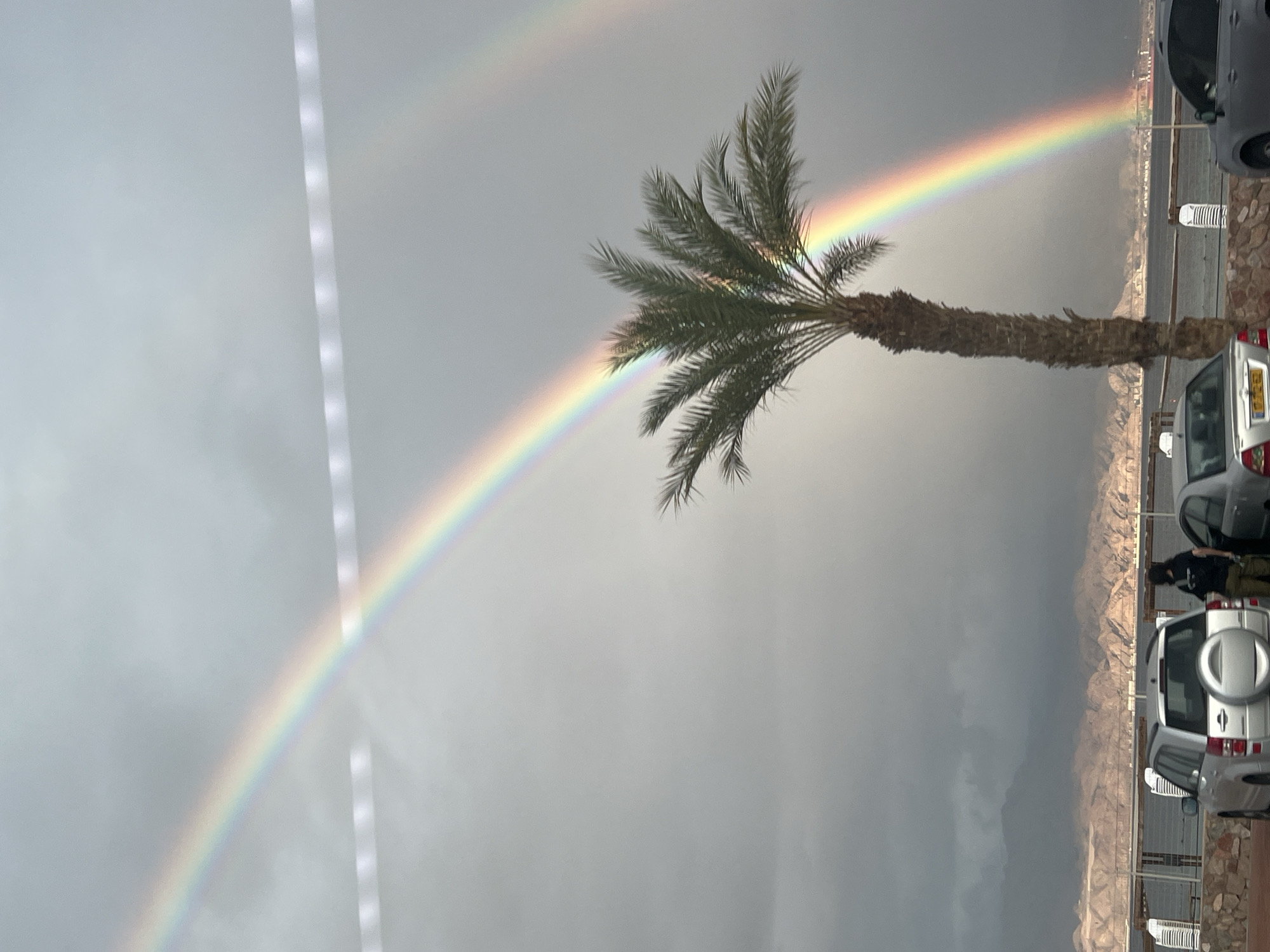 The image displays a coastal scene in Eilat, Israel, under an overcast sky featuring a double rainbow. A tall palm tree with green fronds stands in the mid-ground, positioned slightly to the right of center. The primary rainbow prominently arcs across the sky, with its lower end appearing to terminate near the base of the palm tree and its arc extending over the body of water on the right. A fainter, secondary rainbow is visible above the primary arc. In the foreground, a paved area functions as a parking lot, separated from the water by a low stone wall topped with white railings. A silver SUV with an externally mounted spare tire is parked on the left, facing away from the viewer. To its right, a silver sedan with an Israeli license plate "01-72-53" is also parked. A third, darker grey SUV is partially visible on the far right. Between the silver SUV and the sedan, one individual is standing, facing towards the water. This person is dressed in a dark top and light-colored trousers. Stacked white chairs are visible along the railing. The background reveals the Gulf of Eilat (Red Sea), extending to a distant horizon dominated by light-brown, arid mountains, likely representing the Jordanian coastline. The overall lighting is subdued due to the heavy cloud cover, with brighter light illuminating the rainbow.