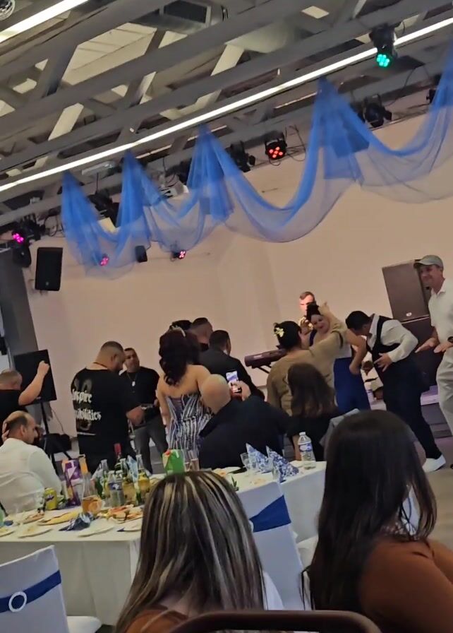 people dancing at what appears to be a wedding reception. The venue is decorated with blue draping hung from the ceiling. A keyboard player is providing music as guests dance and take pictures. There are tables set up around the dance floor. Some people are sitting, watching the dancing. There is a video camera operator in the mix.