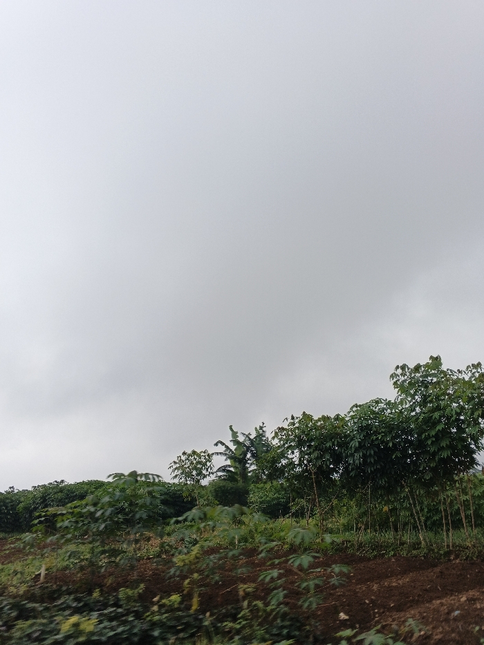 The image displays an agricultural landscape under a uniformly overcast, light grey sky, which occupies the upper 60% of the frame. The lower 40% depicts undulating terrain characterized by dark reddish-brown soil and dense green vegetation. On the far left, a thick growth of leafy shrubs and trees covers a rising slope. Towards the center and right, multiple trees with prominent palmate-lobed green leaves, consistent with cassava or young rubber plants, are visible. A banana tree with broad leaves is discernible in the upper mid-ground, slightly left of center, amidst other dense foliage. Patches of exposed soil indicate active cultivation or recent tilling. No human subjects, man-made structures, or direct signs of human activity are present. The scene is located in Kampong Chhnang, Cambodia.