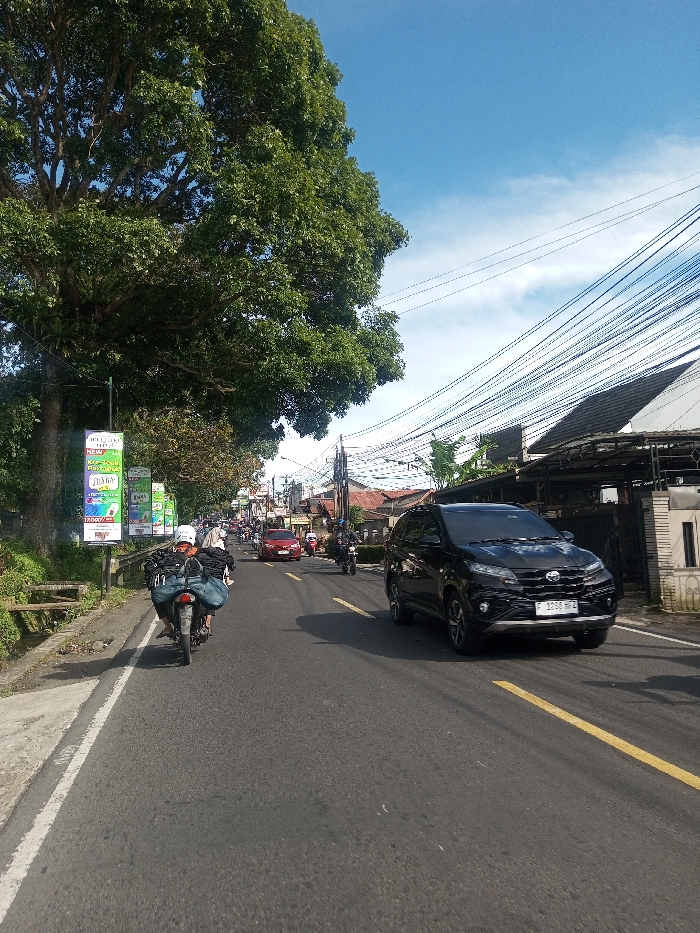 The scene depicts a daytime street view with active vehicle traffic, observed in Indonesia, specifically the Bogor region of West Java, as indicated by the "F 1268 MPL" license plate on the black SUV. The location previously stated as Phonengam, Laos is contradicted by this visual evidence. The environment includes an asphalt road marked with a solid white line on the left edge and a double solid yellow line in the center, indicating two-way traffic. The sky is largely clear blue with some wispy white clouds. On the left side of the road, a large tree with dense green foliage dominates, overshadowing a narrow unpaved shoulder and a concrete curb. Several vertical advertising banners are attached to a pole beneath the tree, displaying text in Indonesian. A small drainage ditch and a wooden bench structure are partially visible on the far left. On the right side, a tangle of overhead power and communication lines runs above various buildings with tiled roofs that line the street. Key subjects and objects include: * A black Toyota Rush SUV, with Indonesian license plate "F 1268 MPL," positioned in the foreground on the right side of the road, facing away from the camera. * A motorcycle in the midground on the left lane, carrying two individuals. The driver wears a white helmet and a dark jacket, and the passenger wears a light head covering and a dark jacket. Blue tarp-wrapped items are secured to the rear of the motorcycle. * A red sedan is visible further down the left lane. * Multiple other motorcycles and vehicles are discernible further down the street in both directions. Vehicles are in motion or positioned within traffic flow. Shadows are present, consistent with bright daylight.