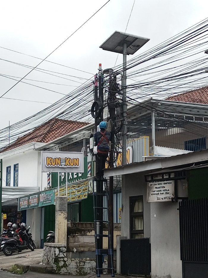 An utility worker in a blue helmet and safety harness is seen on a ladder, working on a utility pole crowded with wires. A solar panel tops the pole. In the background, there is a building with a "Kun Kun" sign, a barbershop, and another building with a medical practice sign displayed. Two motorcycles are parked in front of the shops. The scene conveys a mix of infrastructure and commercial activity in a busy neighborhood. The sky is overcast.