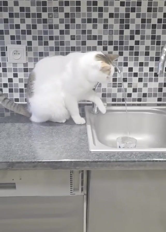 A white cat with a grey and brown tail is sitting on a kitchen countertop next to a stainless steel sink. The cat is reaching for a stream of water coming from the faucet and drinking from it, occasionally dipping its paw into the water. There is a small glass in the sink under the stream of water. The kitchen features a grey countertop and grey cabinets below, along with a tiled backsplash of black and white squares.