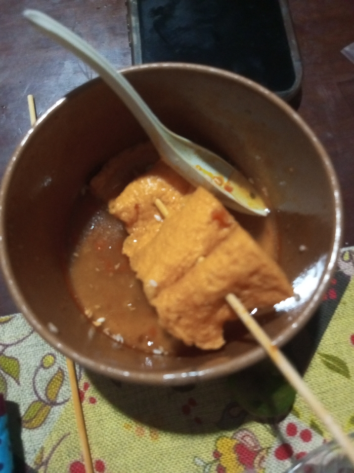 The image displays a close-up, overhead view of a brown ceramic bowl containing a light brown liquid broth with visible red and white particulate matter. Submerged within the broth are at least three irregularly shaped, porous, light orange-brown pieces of food. Two of these pieces are impaled on thin wooden skewers, one protruding upwards from the bowl. A light-colored spoon with faint markings rests in the broth against the far rim of the bowl. The bowl is positioned on a light green fabric surface patterned with yellow and red floral or leaf motifs. In the upper right background, a dark rectangular object resembling a smartphone in a case is partially visible. No individuals are present. The scene is located in Pandaria, India.