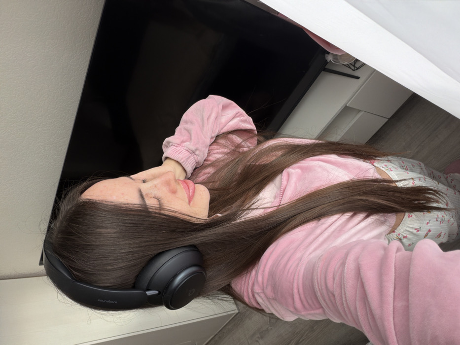 A female individual is depicted indoors in Novosaratovka, Russia. She has long, straight, dark brown hair and is seen in a profile view from the chest up, facing left. She wears black over-ear Soundcore brand headphones. Her eyes are closed, and her lips are parted, showing light pink lip color. She wears a pink velour zip-up jacket and patterned pajama pants, visible below the jacket hem. Her right hand is raised, with fingers touching the back of her head/hair. In the background, a large, dark-colored flat-screen television is mounted above a white two-drawer media console. A small, light-colored decorative object is on the console to the right. The floor appears to be a light-colored wood or laminate. A white curtain or blind is partially visible on the far right. The overall lighting suggests an indoor daytime setting.