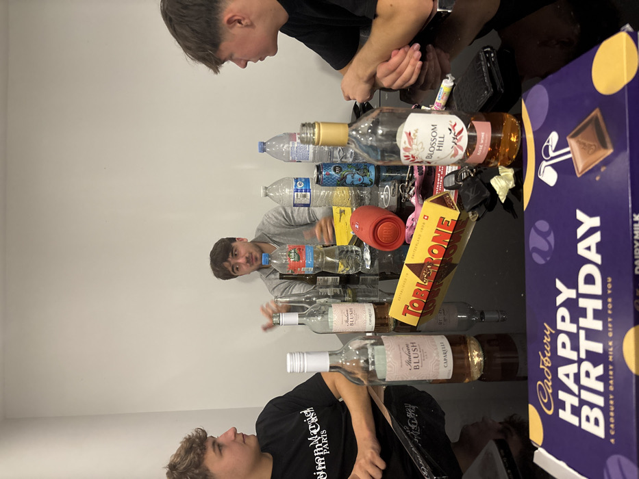 The image depicts three young adult males seated around a dark, reflective table in an indoor setting with plain white walls. The exact location within Newcastle upon Tyne, United Kingdom, is not discernible from the provided visual information. From left to right: A male with light brown, curly hair, wearing a black t-shirt, is positioned on the left, looking towards the center. A male with dark hair, wearing a grey long-sleeved top, is centrally located, actively speaking and gesturing with both hands. A male with dark hair and a faded haircut, wearing a black t-shirt, is on the right, looking towards the center with his hands clasped on the table. The table holds numerous items: In the immediate foreground, a purple Cadbury "Happy Birthday" Dairy Milk chocolate box is visible. Further back, from left to right, are: a nearly full bottle of Caparelli Italian Blush rosé wine, an empty bottle of the same wine, an empty dark glass beer bottle, a plastic bottle of Lösch brand water, an open Toblerone chocolate bar, a red JBL portable speaker, a set of keys on a keyring, a blue and white energy drink can, two additional plastic water bottles (one full, one partially full), a nearly empty bottle of Blossom Hill rosé wine, a small wrapped candy, and a black wallet. The room is brightly and uniformly lit, with no discernible furniture or decor beyond the plain white walls and the table. The scene suggests a casual social gathering or celebration.