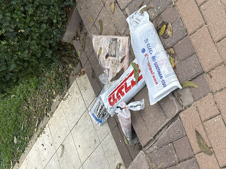 The scene depicts an outdoor pathway in Beit Yitzhak-Sha'ar Hefer, Israel, during daylight. The ground consists of two distinct sections: a light-colored tiled path on the left, transitioning to a raised section of reddish-brown pavers on the right and foreground. Scattered dry, greenish-brown leaves are present across both surfaces. Adjacent to the pathway, on the upper right, is a patch of dense green shrubbery, and a small area of green grass is visible on the upper left. Four distinct bundles, consistent with newspaper deliveries, are present on the reddish-brown pavers and the step leading up to them. 1. The largest bundle, located in the lower right foreground, is wrapped in clear plastic. Visible Hebrew and English text on this wrapper includes "www.yedioth.co.il", "052-9995005", and "*3773", identifying it as likely a publication from *Yedioth Ahronoth*. 2. To its left, on the step, is a rolled bundle encased in clear plastic with a prominent red section displaying white Hebrew text, also appearing to be a newspaper. 3. Further left, another rolled bundle in clear plastic exhibits blue and white branding with Hebrew and English text, suggesting it is a copy of the *Globes* financial newspaper. 4. A fourth, somewhat flattened bundle in clear plastic, showing newsprint with Hebrew text, lies on the pavers to the right of the central red-and-white bundle. A small, empty clear plastic bag is situated near the center bundles. No individuals are present, and no active interactions are occurring. The objects appear to be unattended.