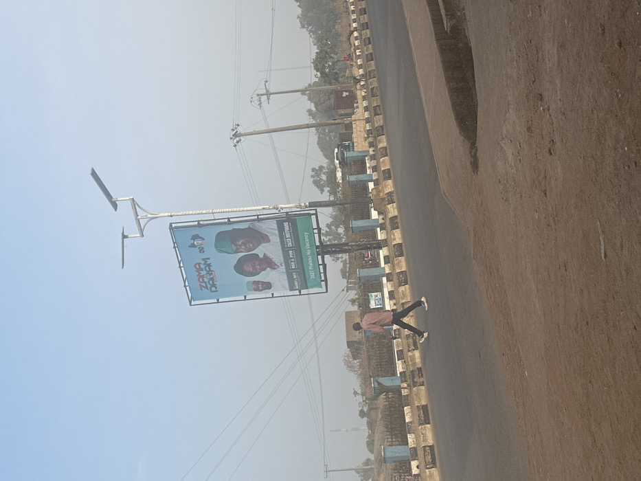 A man walks on the edge of a road with a billboard on the left. The billboard advertises Zaya Dayam and has other unreadable text. Powerlines stretch across the sky. The sky is hazy and pale blue. The road is light brown, and the curb has black and white alternating paint.