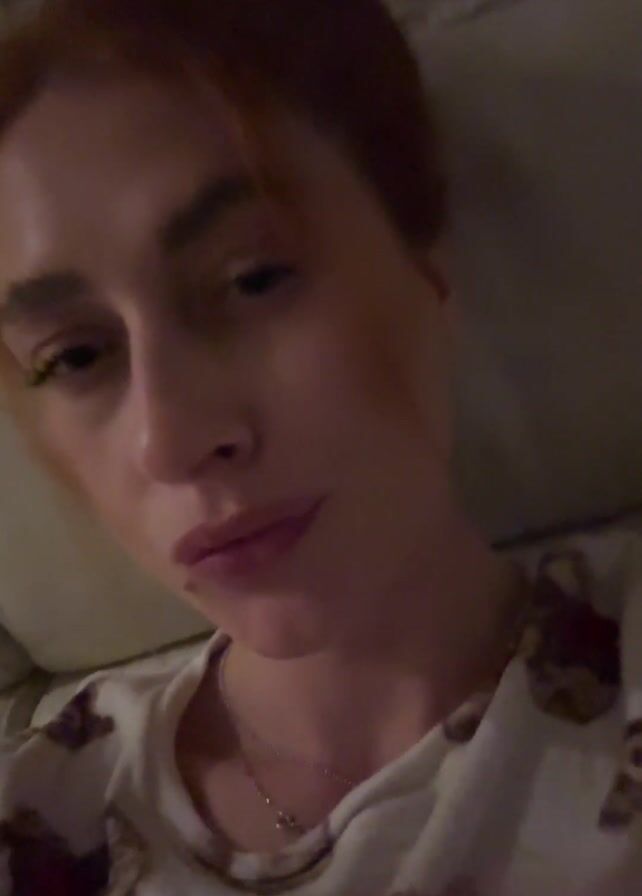 close-up of a woman with red hair, lying down, possibly on a couch. She is wearing a white t-shirt with a pattern of brown and red shapes. She touches her forehead and face with her hand. She has a serious or neutral expression. The background appears to be a wall with a textured pattern, possibly tile or stone. The lighting is somewhat dim. She is wearing a thin necklace.