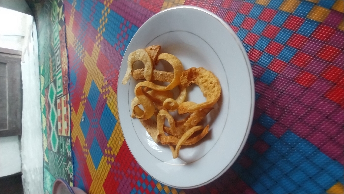 - "A top-down shot shows a white plate with a thin silver rim, holding a pile of golden-brown, curled pork rinds" by FM-t5Tl43, licensed under CC BY 4.0