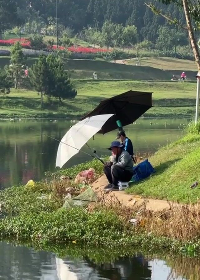 Two people are fishing by a lake. They are sitting on the grassy bank, using two umbrellas to provide shade. One umbrella is black, and the other is white. The person closer to the camera is holding a fishing rod, looking at the water. A blue bag and fishing net are nearby. Litter is scattered around them on the bank. The lake reflects the umbrellas and the sky. Across the lake is a grassy park area with trees, flowers, and people walking and riding bikes.