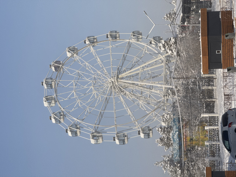 A large, white Ferris wheel dominates the frame against a clear blue sky. Snow-covered trees and buildings are visible on the right side, along with a light post and a glimpse of a white car. The wheel's intricate spoke and gondola structure contrasts with the simple blue backdrop, creating a serene winter scene.
