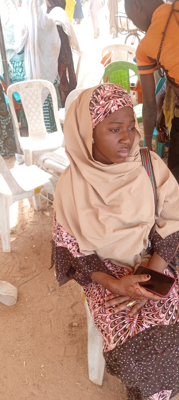 The image captures an outdoor scene in Rijiyar Zaki, Nigeria, featuring a seated young woman in the foreground