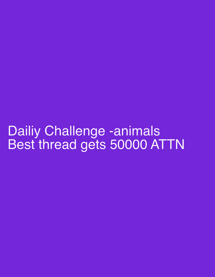 The image presents a digital graphic with a solid, uniform purple background. Centrally positioned in the lower portion of the frame are two lines of white, sans-serif text. The first line reads: "Dailiy Challenge -animals". The second line, directly below it, reads: "Best thread gets 50000 ATTN". No people, animals, distinct physical objects, specific actions, or interactions are visually depicted. The environment is entirely abstract, consisting solely of the color field and text. There is no visual information within the image to determine a specific location within the city of Krasnovo, Bulgaria.