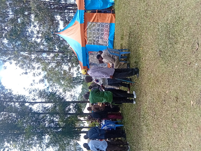 The scene depicts an outdoor gathering on a grassy field in Chevaywa ward, Kenya