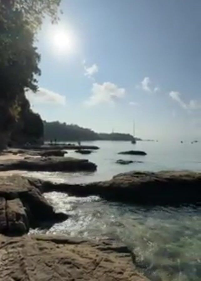 The video pans right, across a clear, calm body of water. The foreground consists of tan and gray rocks with the very shallow water lapping gently against them. On the left, a rocky cliff covered with trees and shrubbery angles down to the beach. The sun shines brightly. People stand on the beach and rocks in the middle distance. Numerous sailboats dot the horizon. Low hills are visible beyond them. The sky is light blue with some puffy white clouds.
