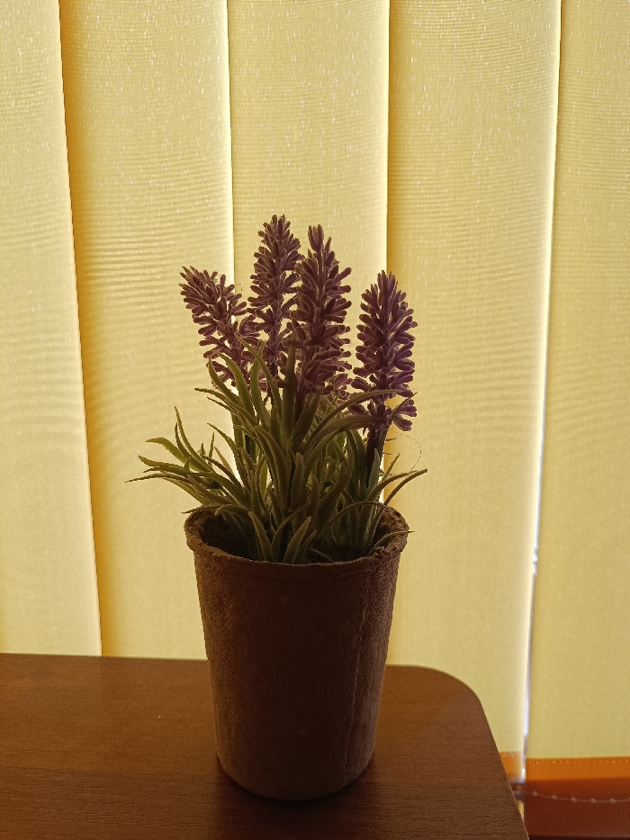 A small, dark brown, fibrous pot containing an artificial plant resembling lavender is positioned on a dark brown, wood-grained surface. The plant features multiple clusters of densely packed, dark purple, spiky florets and slender green leaves. The background consists of light yellow or cream-colored vertical blinds, illuminated, suggesting a window behind them. No people are visible. No actions or interactions are depicted. The specific location within Targovishte, Bulgaria, cannot be determined from the visual information provided.