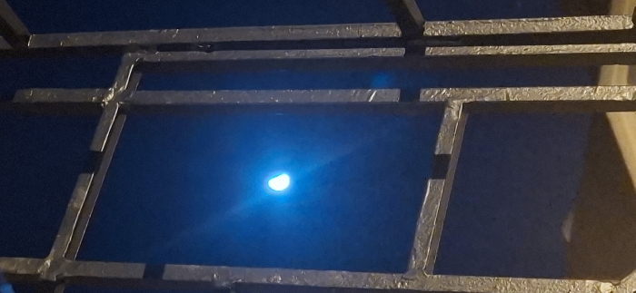 The scene depicts an outdoor nighttime environment in Temara, Morocco. A crescent-shaped light source, consistent with a moon, emits a prominent blue luminescence and lens flare against a dark blue sky. This light source is observed through a rectilinear framework of dark, textured metal bars, which form several openings. The metal bars display surface irregularities and some light reflection. A dimly lit, flat surface, possibly ground or pavement, is visible at the bottom of the image, illuminated by ambient light. No individuals or active subjects are present.