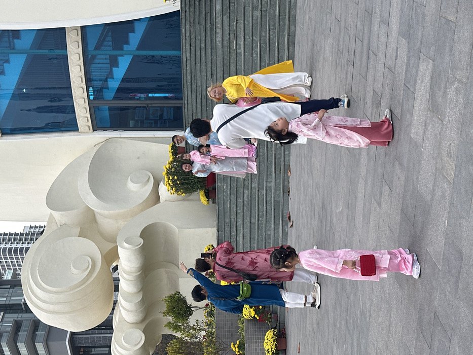 The scene depicts an outdoor plaza in front of the Nha Trang City Museum in Nha Trang, Vietnam. The museum's distinct wave-like architectural facade, constructed from light-colored material, is prominent on the left, with blue-tinted glass windows and a doorway visible on the right. A set of grey stone steps leads up to the building. Potted yellow chrysanthemums adorn the base of the building and steps, indicating a celebratory period. Eleven individuals are visible. In the immediate foreground, two young girls wear pink áo dài; one stands with her back to the camera holding a small red handbag, while the other faces right, looking upwards. On the steps, a family group poses for a photograph: a woman in a light grey áo dài holds a baby in a pink áo dài, a young child in a pink áo dài stands next to them, and a man in a light blue áo dài stands behind them. An older woman in a bright yellow áo dài and white pants stands to their right. Three individuals are engaged in photography: one man in a white áo dài with a black shoulder bag photographs the posing family, another man in a pink patterned áo dài also photographs them, and a man in a blue áo dài with a green fanny pack gestures with his right arm raised. Tall, modern city buildings are visible in the background.