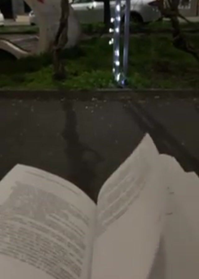 person reading a book outside at night. The view is from the person's perspective, focusing on the open book. In the background, there's a sidewalk, grass, trees, a modern sculpture, and parked cars. A pole decorated with white lights is visible. The camera pans up to show a long pergola strung with warm white lights above a walking path with benches. The street appears wet.