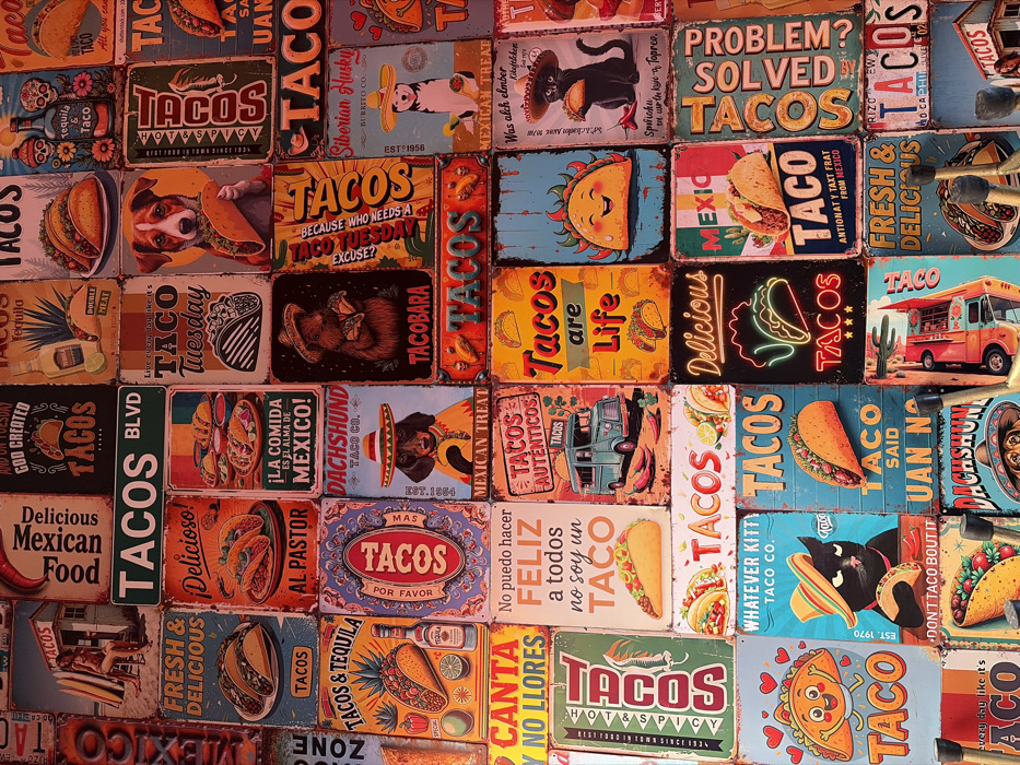 - "The image displays a collection of vintage-style signs, predominantly promoting tacos" by FM-jOPsh2, licensed under CC BY 4.0