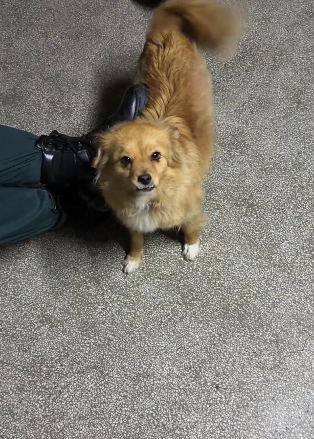 A small, golden-brown, fluffy dog with white paws and a white chest is standing on a gray, speckled floor. The dog is wagging its tail and looking up. To the left, a person wearing dark green pants and black boots is visible. Another person wearing black shoes with white stripes is standing behind the dog.
