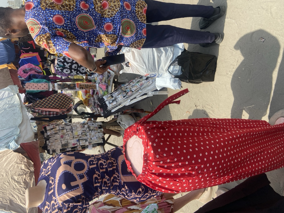 This image depicts an outdoor market scene in Alasia, Nigeria, under bright daylight, indicated by prominent shadows on the light-colored, dusty ground. In the foreground on the left, an upper-torso mannequin with light skin tone displays a navy blue, fitted short-sleeve dress patterned with repeating light brown "Dior" branding. To its right, a lower-body mannequin or display stand is covered by a long red skirt featuring small white floral patterns, tied at the top. Partially visible to the far left are the lower legs and feet, wearing light-colored closed-toe shoes, of another individual or mannequin. To the right, a male individual stands facing away from the camera, wearing a short-sleeved blue shirt with distinct red, brown, and white circular patterns, dark blue trousers, and black clogs or slip-on shoes. He holds a black smartphone in his right hand. A silver-colored bracelet or watch is visible on his left wrist. Behind the figures, a market stall is visible, displaying various goods. Numerous small, packaged items, possibly earrings or hair accessories, are hung vertically on a display rack. Other clothing items, including patterned fabrics and garments, hang from makeshift structures. Overhead, light-colored tarps or canopies provide shade. A white plastic bag and a black plastic bag are visible on the ground near the male individual's feet.