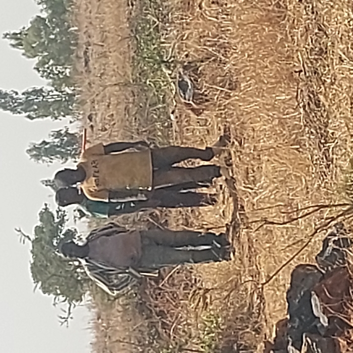 In a rural setting, four people are walking through dry vegetation. Trees are scattered in the background. The foremost person carries what appears to be a bundle of sticks. One individual wears a yellow shirt with writing on it. The ground is covered with brown, dry grass. The sky is overcast. Overall, the scene depicts a group traversing a field, likely engaged in rural activities.