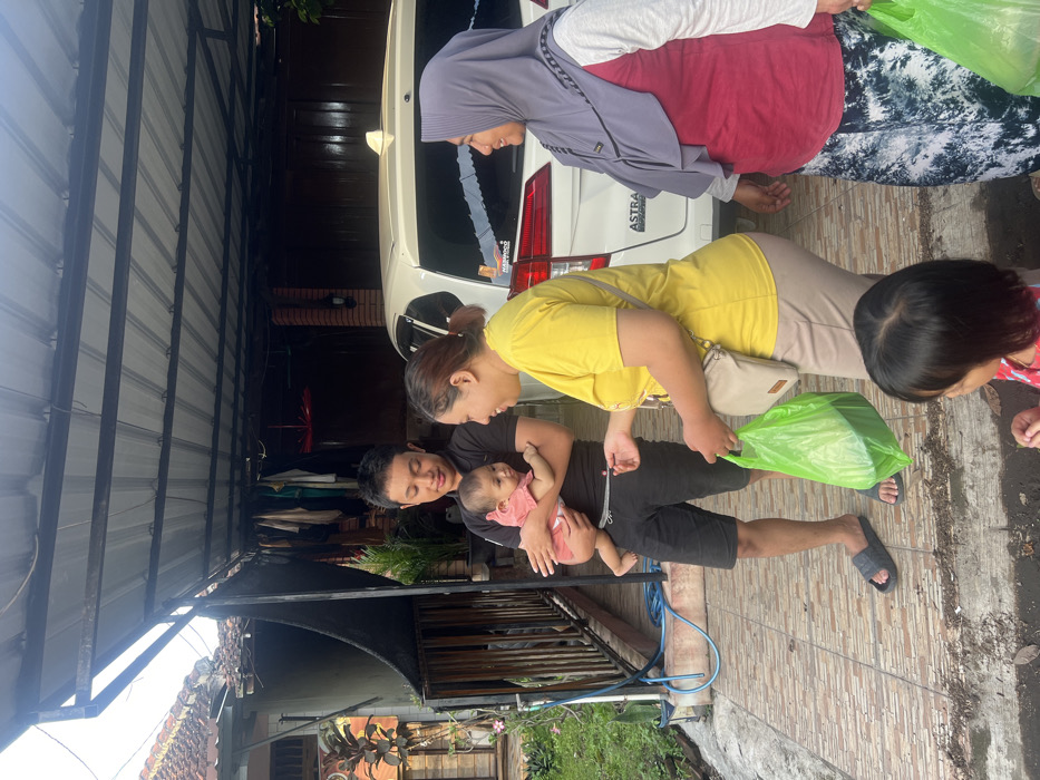 An outdoor scene in a residential area of Kecamatan Pati, Indonesia, depicts five individuals in daylight