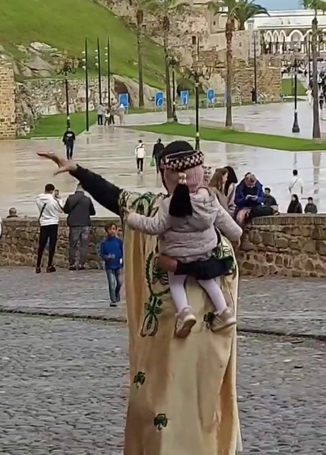 - "A man dressed in traditional Moroccan attire is holding a young child in his arms while standing in a public square paved with cobblestones" by FM-pNPMj1, licensed under CC BY 4.0