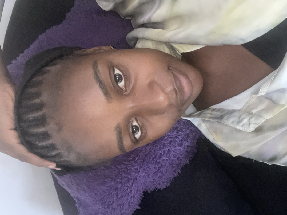The scene is an indoor environment in Sabon Tasha, Nigeria. An adult female, with a dark complexion, is depicted in a close-up, head-and-shoulders portrait. She gazes directly at the camera with a slight, closed-mouth smile. Her hair is styled in cornrows, pulled back, with a black band or fabric visible at the hairline. A hand, with visible fingernails, rests on top of her head, indicating a possible hair adjustment. She is wearing a light-colored, patterned button-up shirt over a dark inner garment. Her head is supported by a deep purple, plush cushion. A dark surface is visible adjacent to the cushion on the left side of the frame.