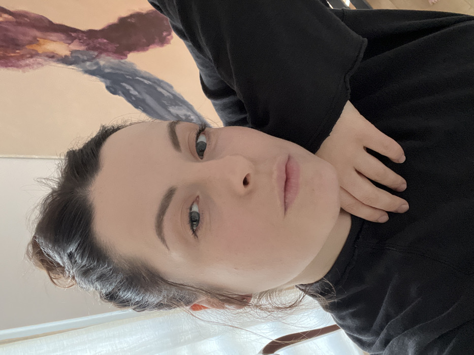 The scene is an indoor setting in Gangloff, Germany. A single female subject is depicted from the upper chest, facing the camera directly. She has dark brown hair styled in a bun on top of her head, light-colored eyes, and a neutral facial expression with her lips slightly parted. Her left hand is positioned beneath her chin, with fingers resting against her jawline and upper chest. She wears a black long-sleeved top, possibly a sweatshirt, featuring a crew neck and a visible frayed or unfinished cuff on the right sleeve. The background to the subject's left includes a portion of a vertical, light-colored curtain. To the subject's right, an abstract artwork is visible on a light-colored wall, characterized by broad brushstrokes of purple, orange, and blue pigments.