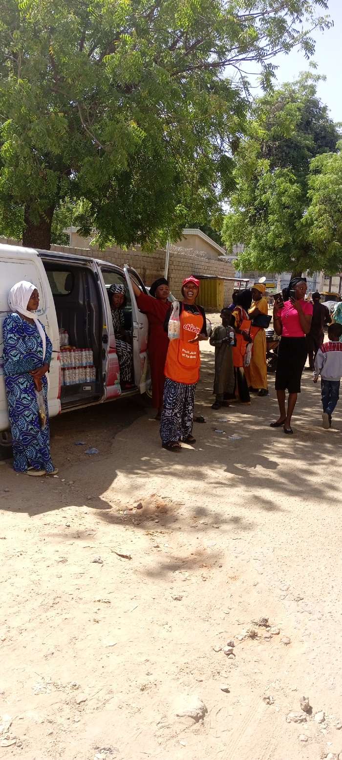 This image depicts an outdoor scene in Tudun Wada, Nigeria, under bright daylight. A white commercial van is positioned on an unpaved, light-brown dirt surface, with its passenger side door open. Inside the van, stacks of small, clear bottles containing a white liquid are visible. Several individuals are present around the van. On the far left, a woman in a blue patterned dress and a white headscarf stands facing right, next to the van. Inside the van's open door, another woman in a patterned dress is seated. Adjacent to the van, a woman in a reddish-brown garment stands, partially obscured, facing the right. In the center foreground, a woman wearing an orange apron displaying "Chivita" branding and "Fruit Juice on the Block" text, a red baseball cap, and patterned pants, stands smiling towards the camera. She holds a transparent plastic bag containing a white bottle. To her immediate right, a young boy in a dark garment stands holding a similar bottle. Further to the right, a woman in a bright pink short-sleeved top and a black skirt is looking at a smartphone she holds in her hands. Other adults and children are partially visible in the mid-ground and background, some looking towards the camera, others engaged in different directions. The ground consists of dry, light-colored soil with scattered small rocks and tire marks. Shadows from large, leafy green trees overhead are cast across the ground and some individuals. In the background, beyond the trees and people, structures resembling buildings with light-colored walls and a perimeter fence topped with barbed wire are visible under a clear, bright sky.