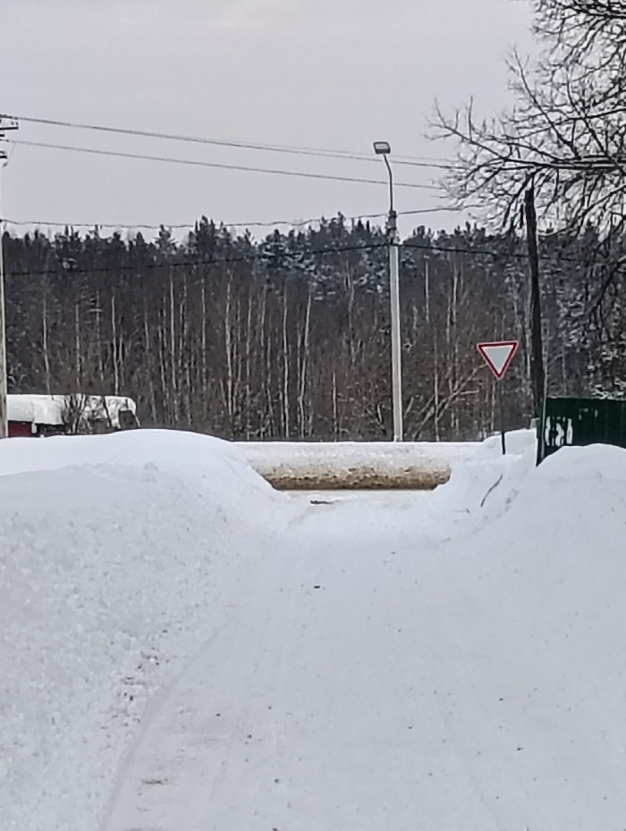 The image depicts a snow-covered street or path in the city of Красный Маяк, Russia, under an overcast winter sky. The foreground features a cleared snowy path flanked by deep snowbanks, leading towards a brown, less-snowy or muddy section in the mid-ground. The path shows subtle tire tracks or impressions. To the left, a utility pole with overhead power lines stands near a partially visible building with a red roof and white walls, largely obscured by snow. In the mid-ground right, a white triangular "Give Way" sign with a red border is mounted on a pole, partially in front of a dark green fence or structure. Bare tree branches are visible to the right of the sign. A street light on a tall pole is positioned centrally behind the path. The background consists of a dense forest line, comprising both bare deciduous trees and dark green coniferous trees. No individuals are present in the scene.
