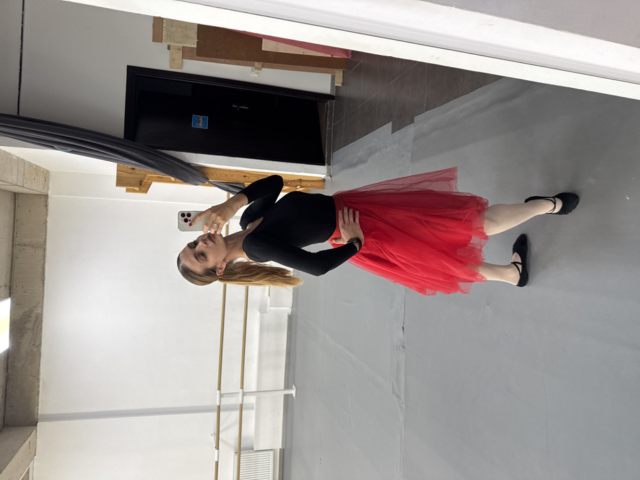 A female individual is depicted in a full-length mirror selfie taken within a dance studio located in Tbilisi, Georgia
