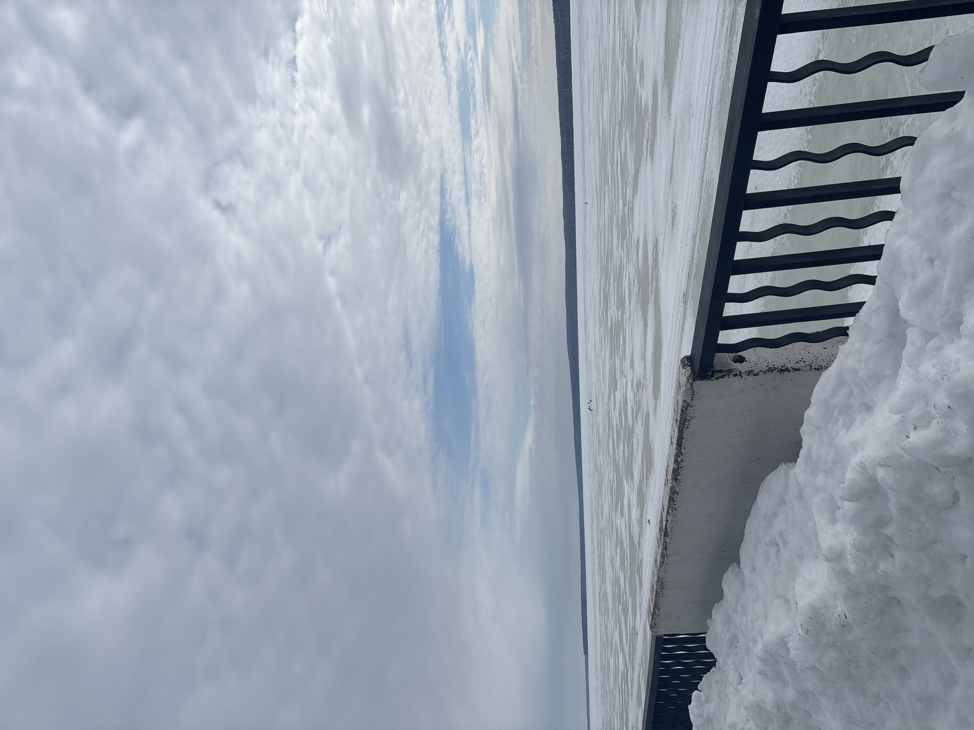 The image depicts a wide-angle, horizontal view of the frozen Votkinsk Reservoir in Chaikovsky, Russia, under an overcast sky. The upper two-thirds of the frame consist of a sky filled with grey and white stratocumulus clouds, with a distinct horizontal band of lighter blue sky visible in the middle. The reservoir's surface is entirely frozen, covered in a textured mosaic of ice and snow, extending to a dark, thin line of forested land at the distant horizon. In the lower foreground, a substantial mound of white, uncompacted snow is piled against a weathered, off-white concrete retaining wall, which runs horizontally across the lower part of the image. A black metal railing with distinctive wavy vertical bars is positioned in front of and partially atop the concrete wall, extending from the left to the right side of the frame. On the frozen surface of the reservoir, in the middle distance, a cluster of approximately three to four indistinct dark figures is visible, appearing to stand or walk on the ice. Further to the right and slightly closer, a solitary, smaller dark figure is also present on the ice. Closer to the foreground, just beyond the railing, two faint white specks are discernible on the ice, one of which resembles a white bird, possibly a swan. No other specific actions or interactions are clearly identifiable.